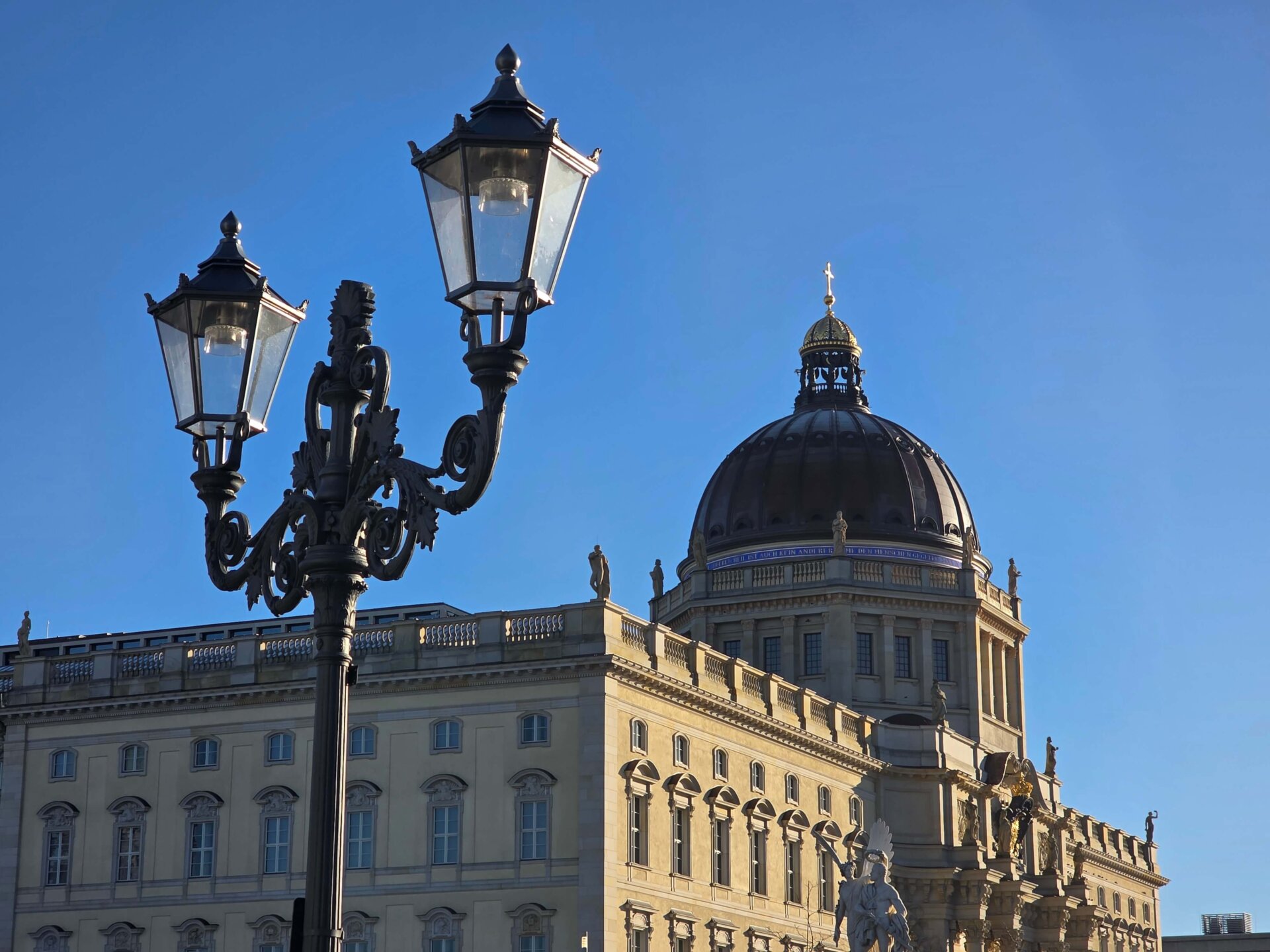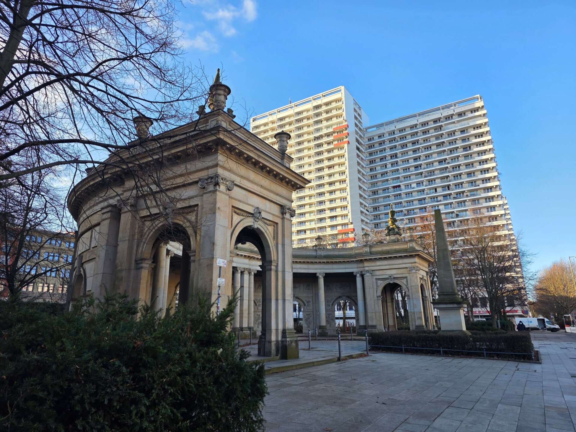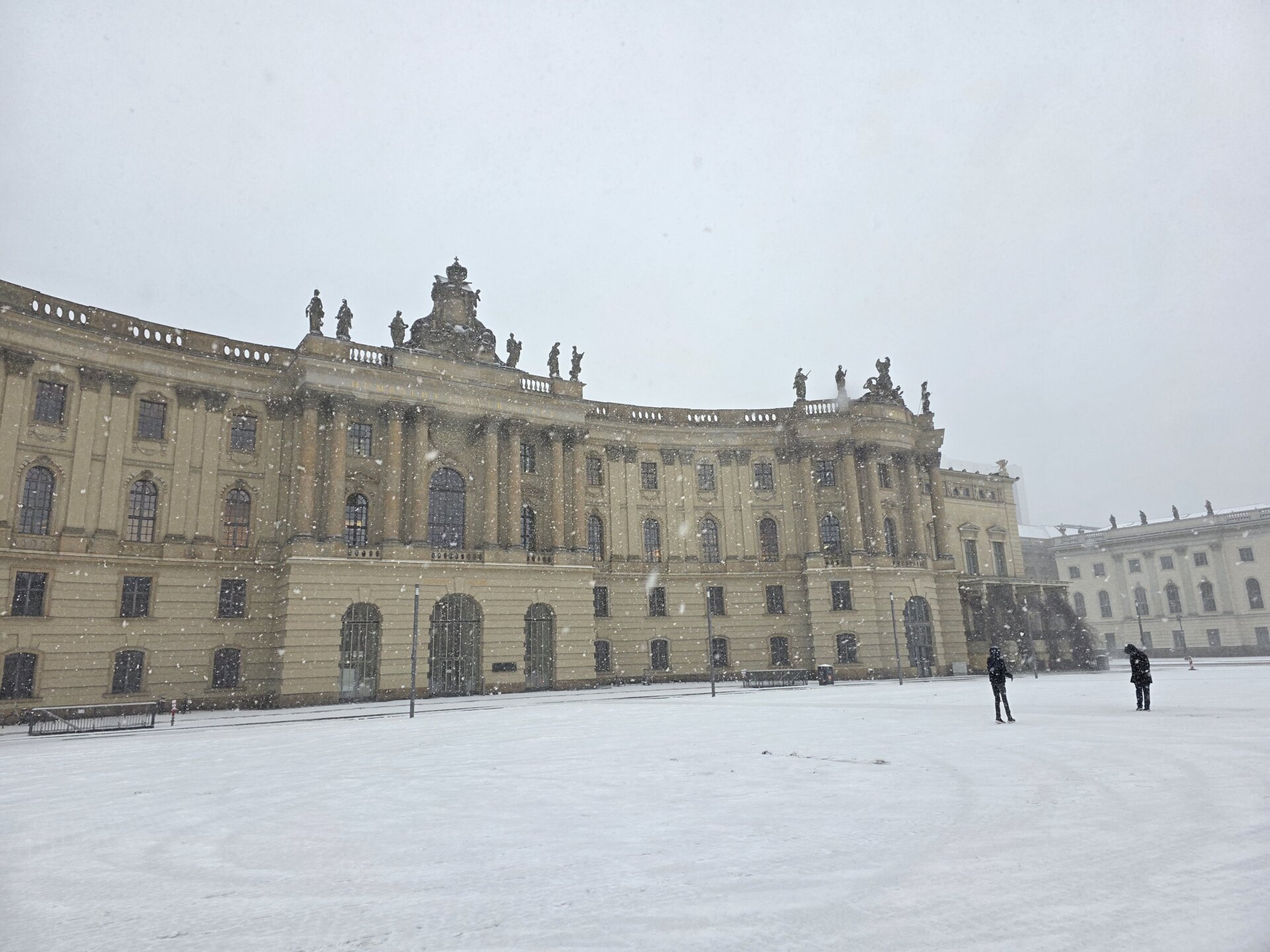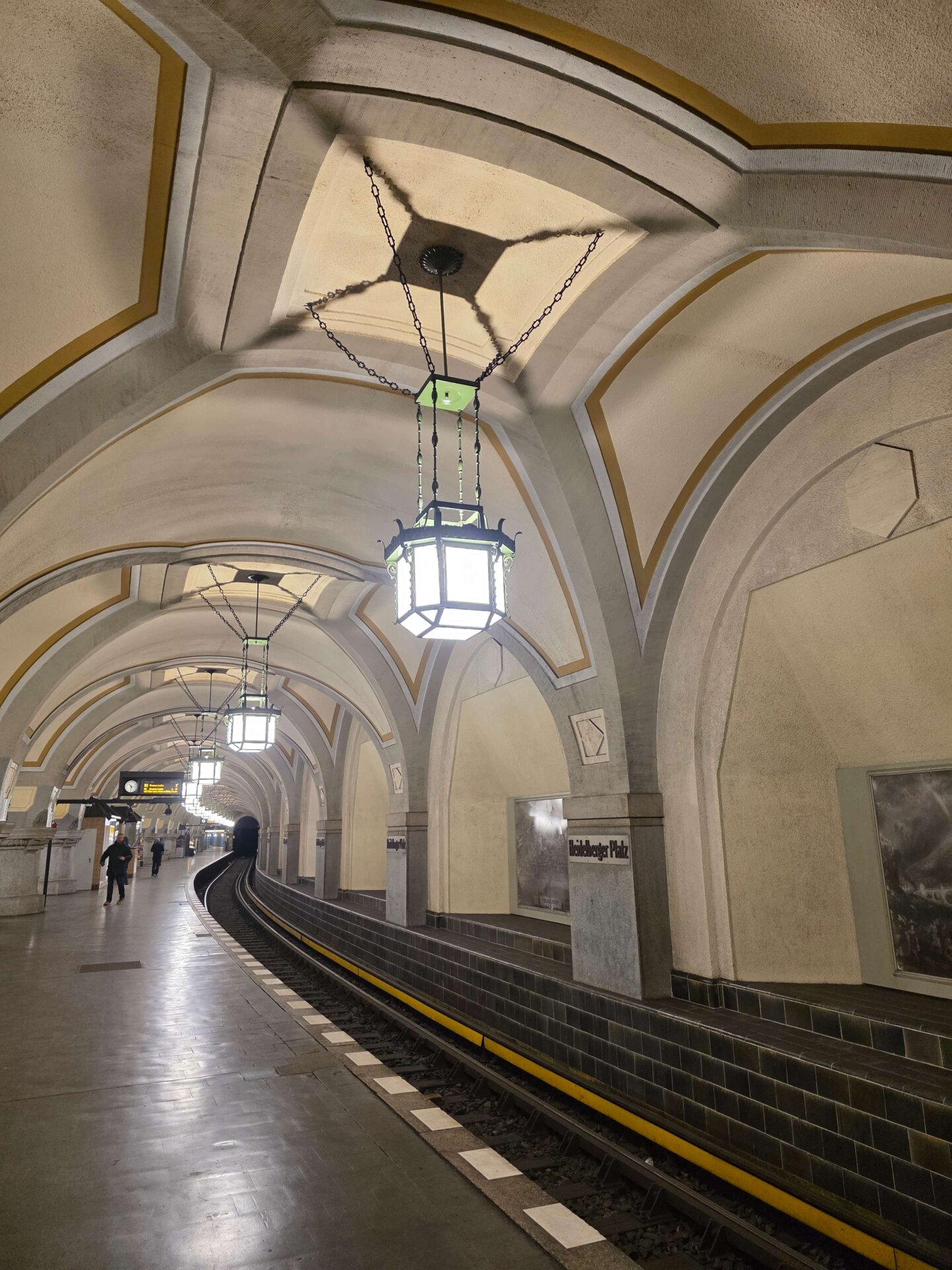 Ved Bundesplatz St. stod vi af for at kigge på et gavlmaleri, inden vi tog toget et enkelt stop videre for at kigge på Heidelberger Platz St., hvor undergrundsstationen var virkelig flot. Vi fortsatte videre til Unter der Linden St., der også skulle være en flot station. Ja, den var fin, men ikke noget specielt som Heidelberger Platz. Vi gik tilbage ad Unter der Linden og nød det flotte solskinsvejr. Alle de gamle bygninger bliver bare endnu smukkere med en blå himmel i baggrunden. Men trods sol var der stadig ret glat på fortovene mange steder. Her i Berlin bliver der enkelte steder spredt småsten ud, men man salter altså ikke, kan vi nu konstatere med sikkerhed.