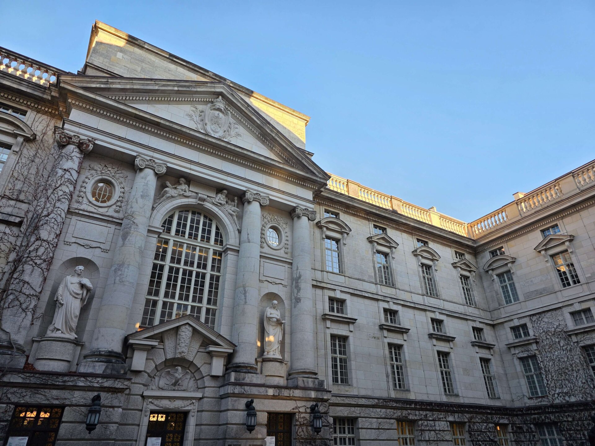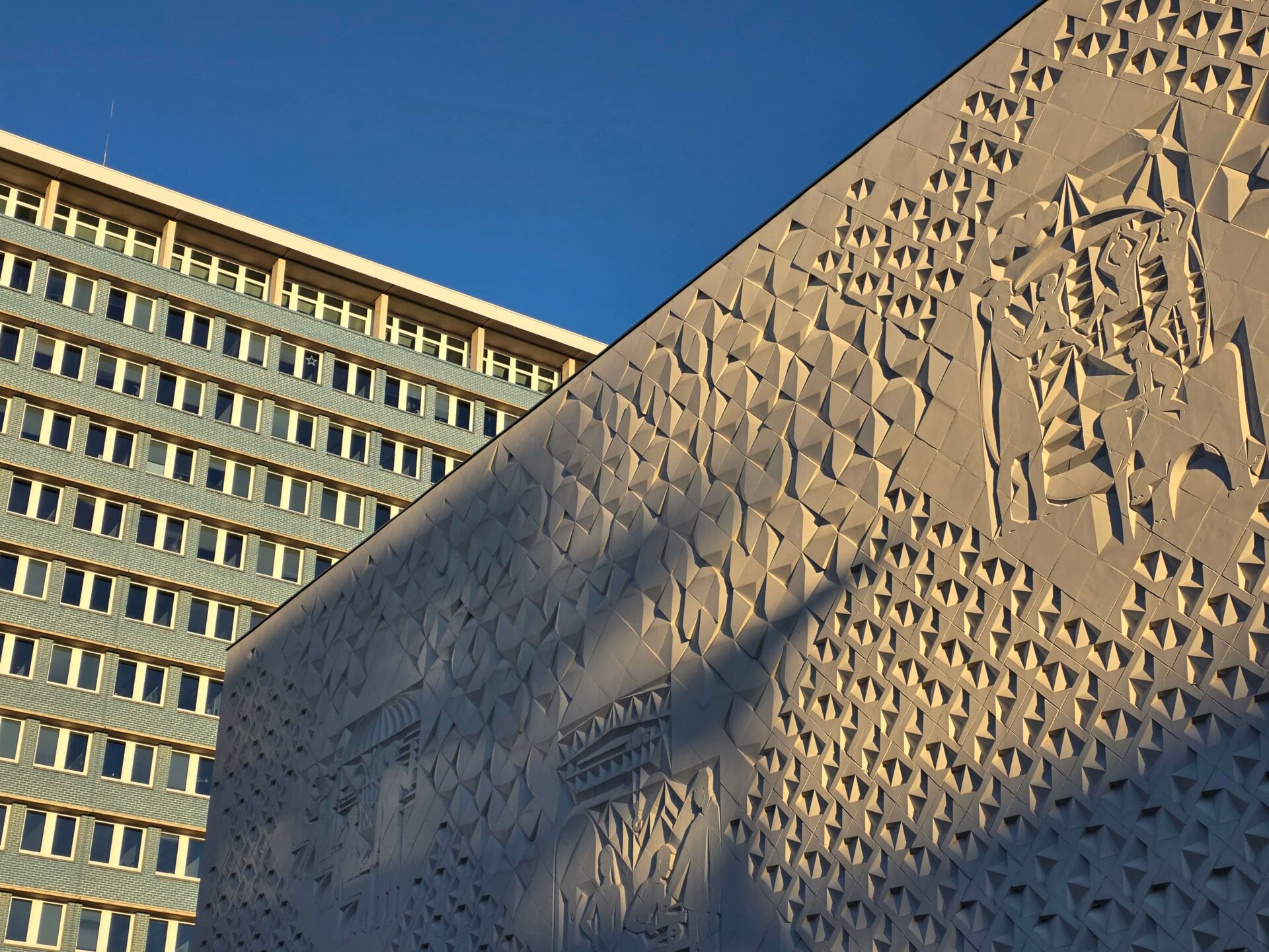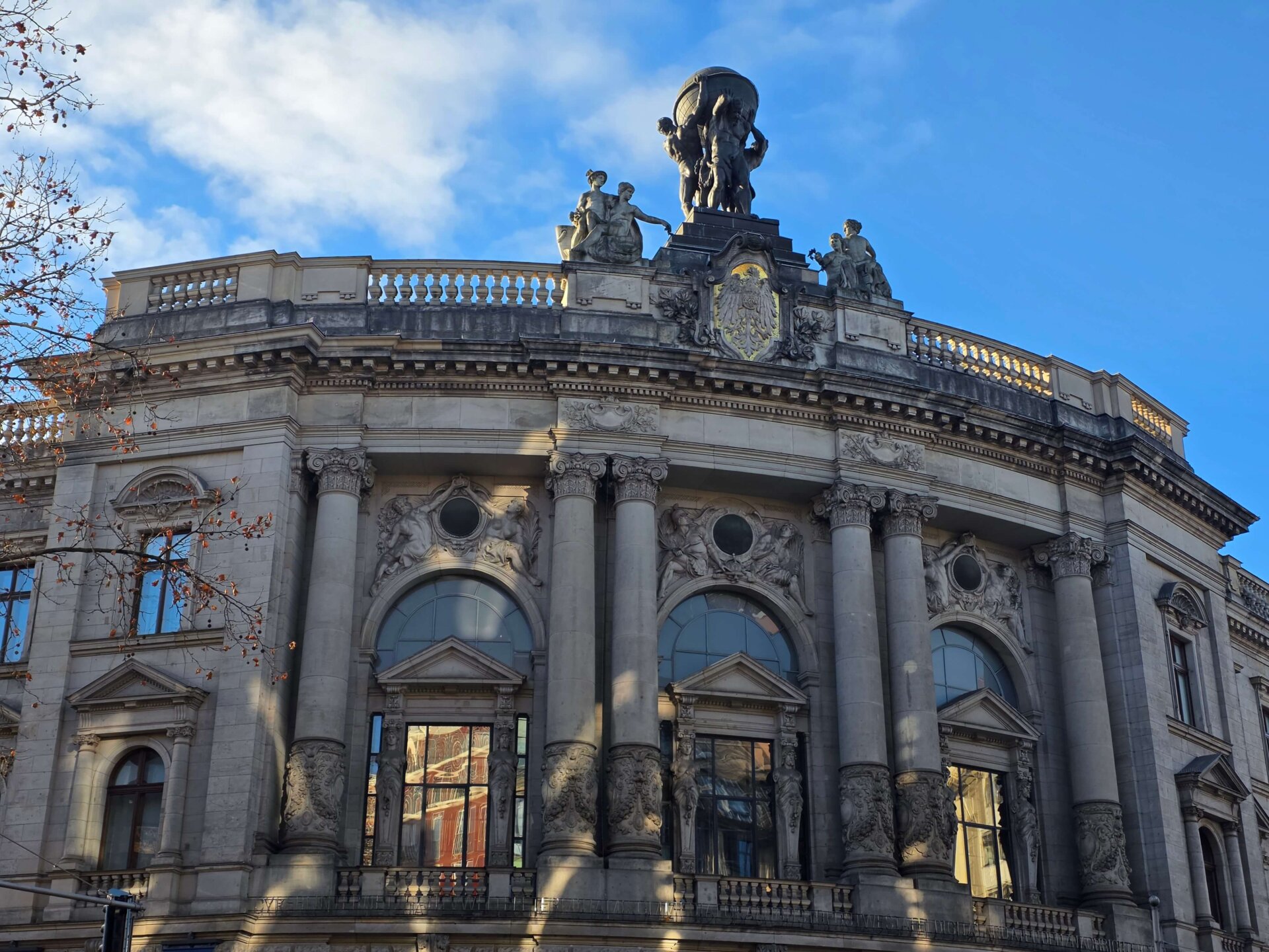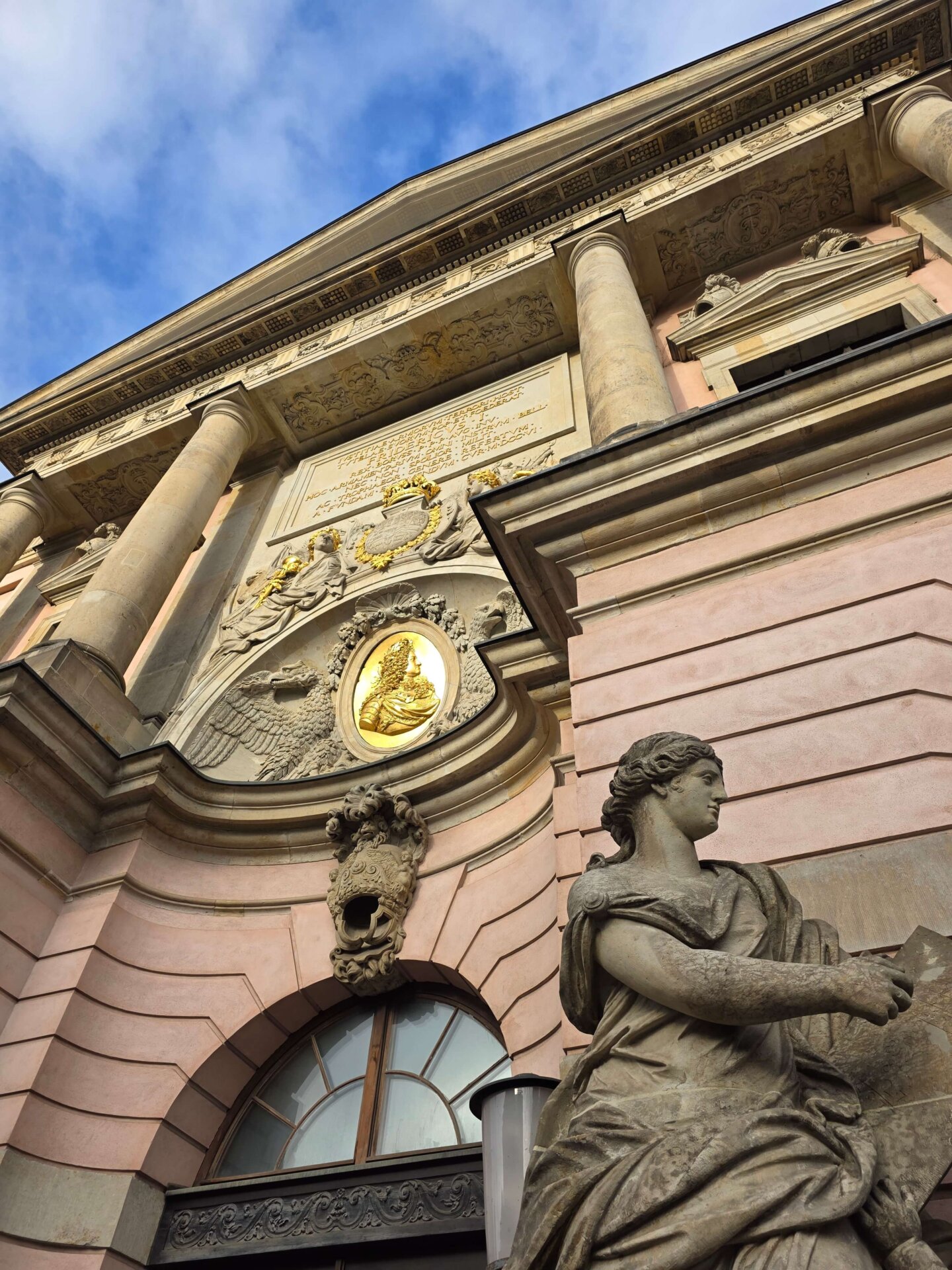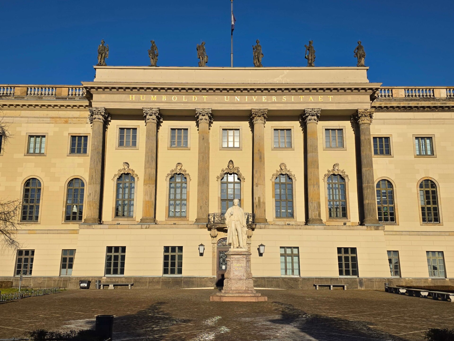 Ved Bundesplatz St. stod vi af for at kigge på et gavlmaleri, inden vi tog toget et enkelt stop videre for at kigge på Heidelberger Platz St., hvor undergrundsstationen var virkelig flot. Vi fortsatte videre til Unter der Linden St., der også skulle være en flot station. Ja, den var fin, men ikke noget specielt som Heidelberger Platz. Vi gik tilbage ad Unter der Linden og nød det flotte solskinsvejr. Alle de gamle bygninger bliver bare endnu smukkere med en blå himmel i baggrunden. Men trods sol var der stadig ret glat på fortovene mange steder. Her i Berlin bliver der enkelte steder spredt småsten ud, men man salter altså ikke, kan vi nu konstatere med sikkerhed.