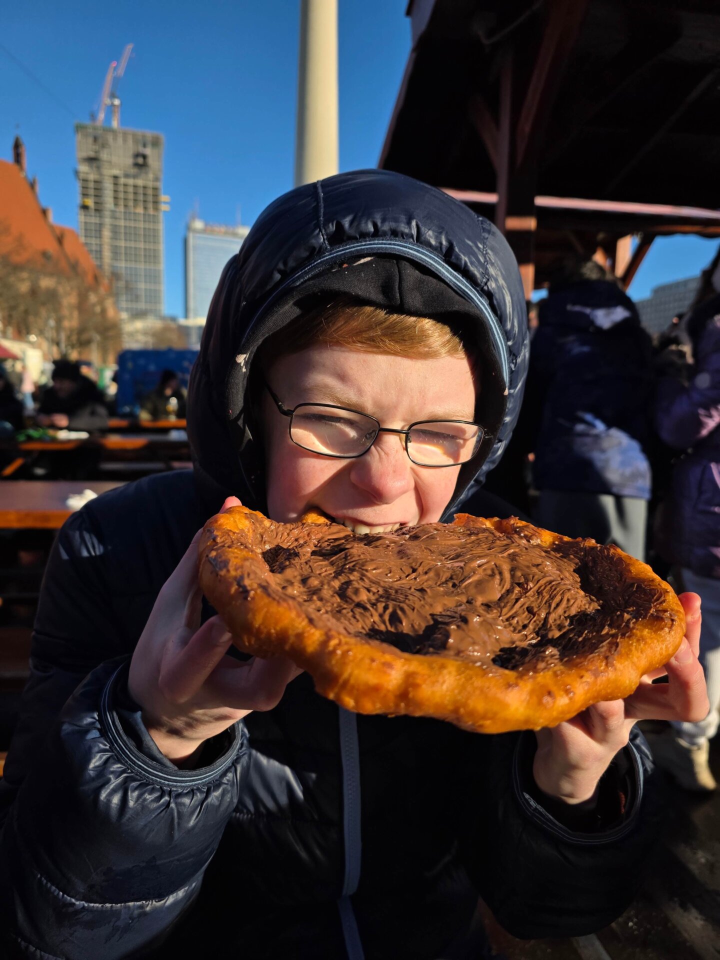 Ved frokosttid var vi meget belejligt nået til julemarkedet ved Rotes Rathaus, hvor vi delte en käse krainer og et handbrot, inden et langosbrød med Nutella til dessert.