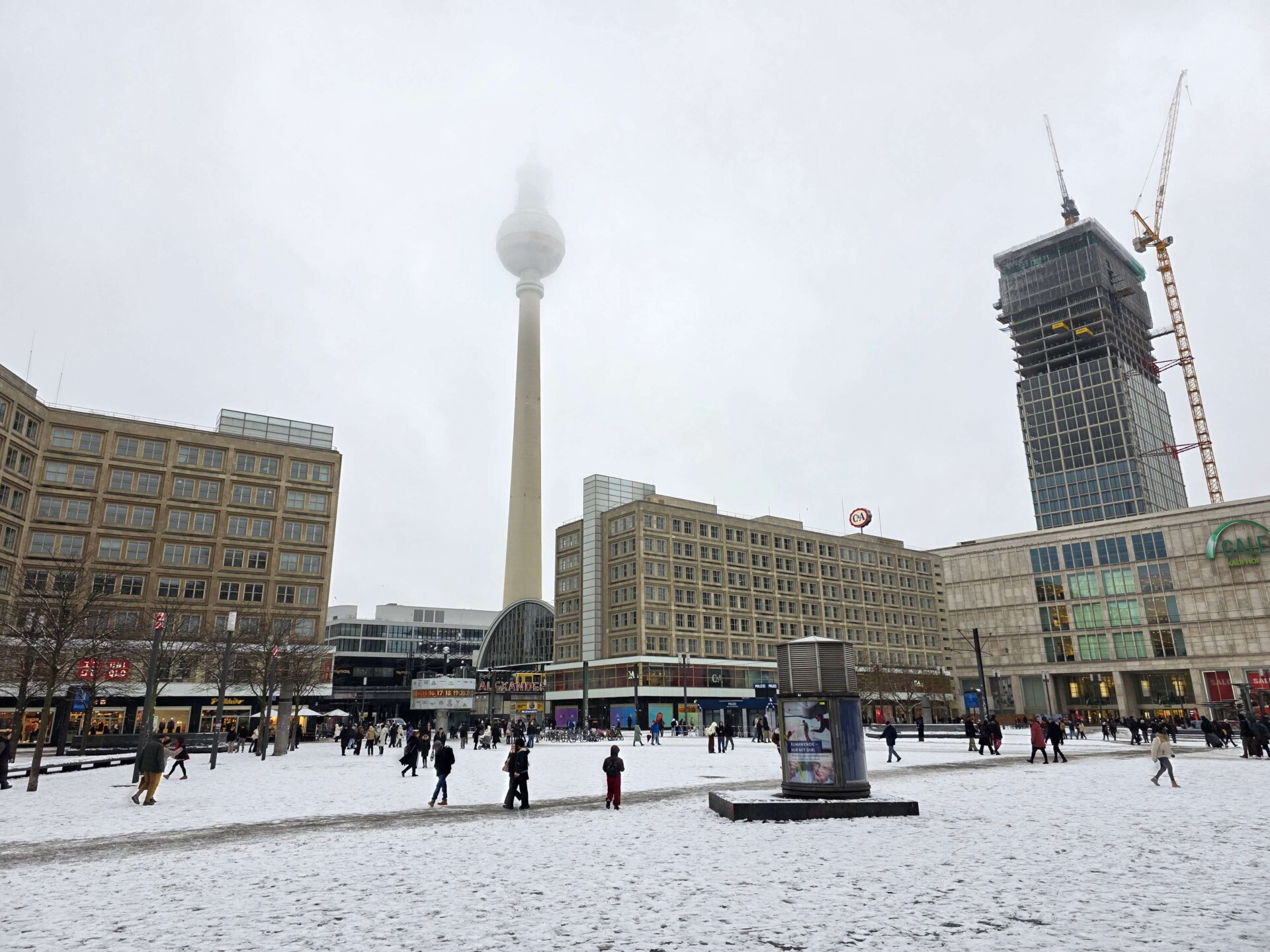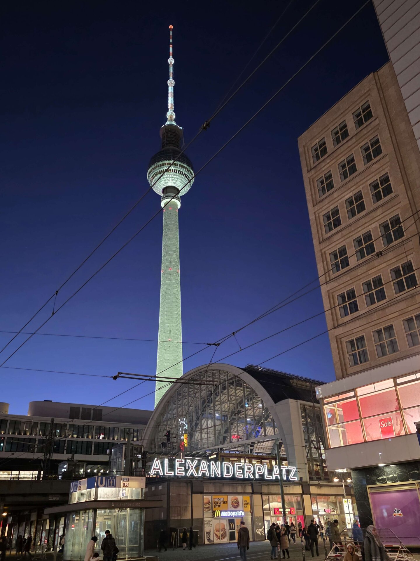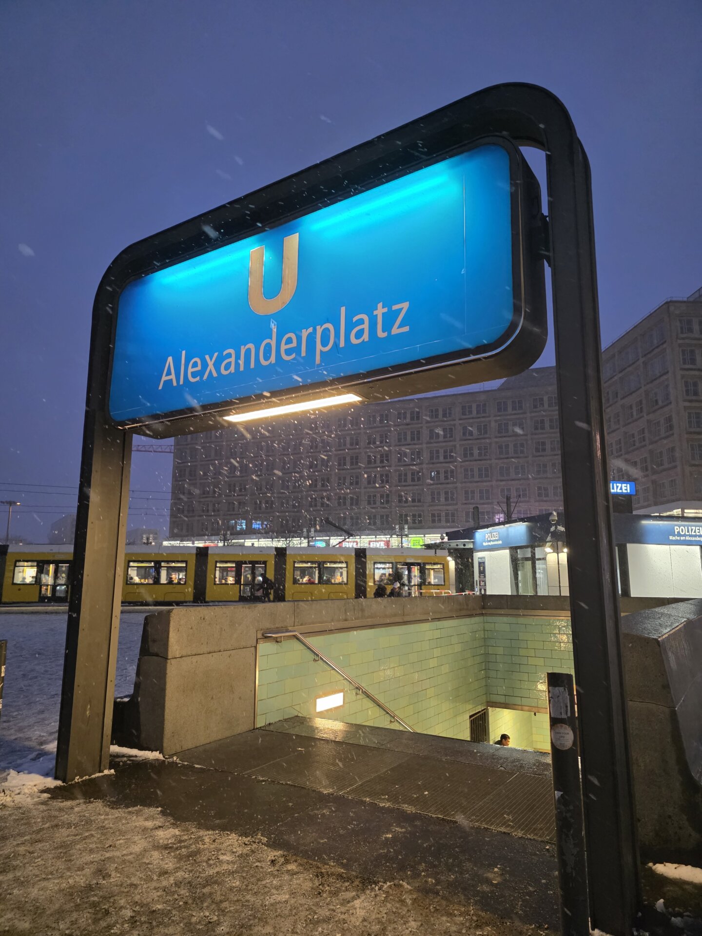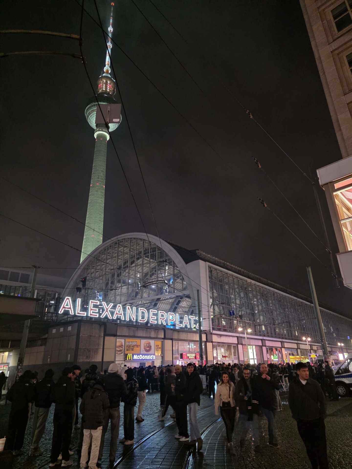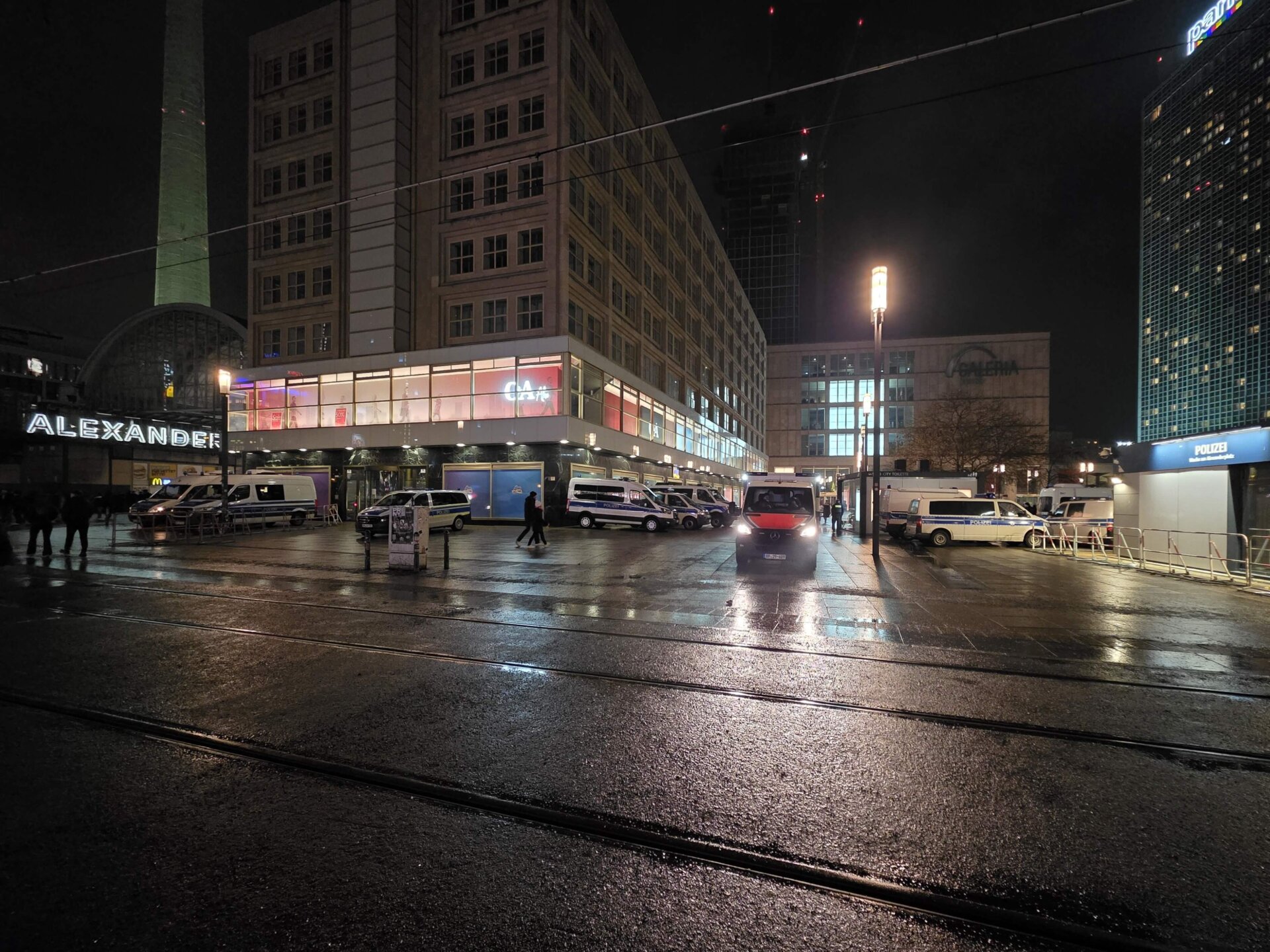 Med mængden af betjente måtte Alexanderplatz må det være et af de sikreste steder i Berlin. Vi talte mindst 15 mandskabsvogne, ligesom store mobile projektører lyste området op. Ved nogle indgange til pladsen stod folk i lang kø for at blive lukket ind.