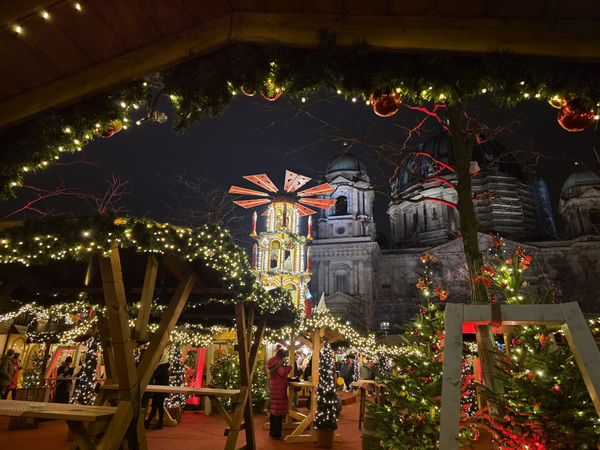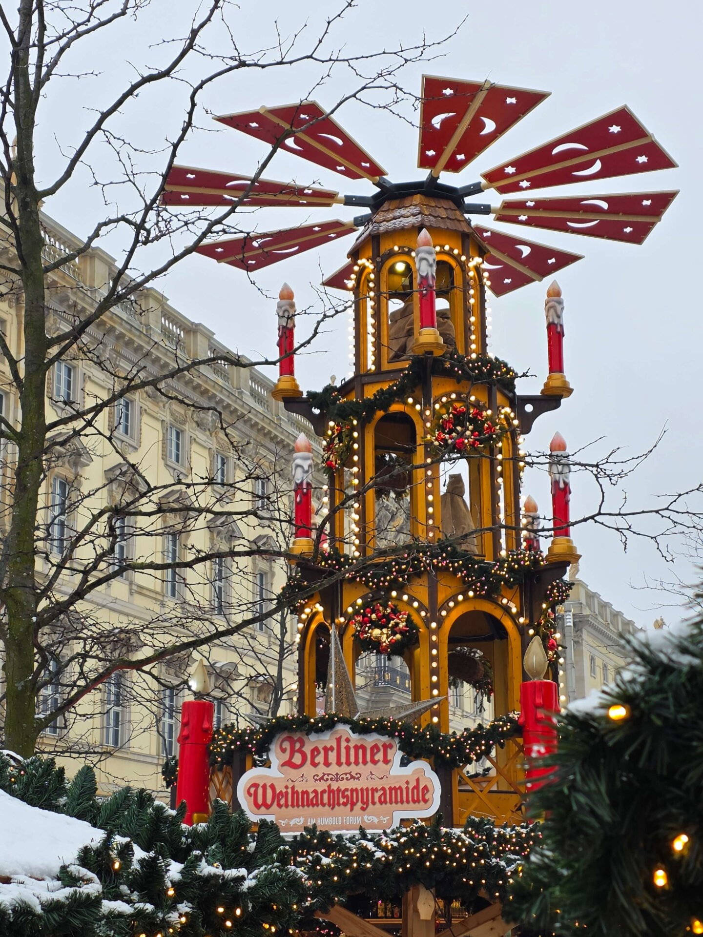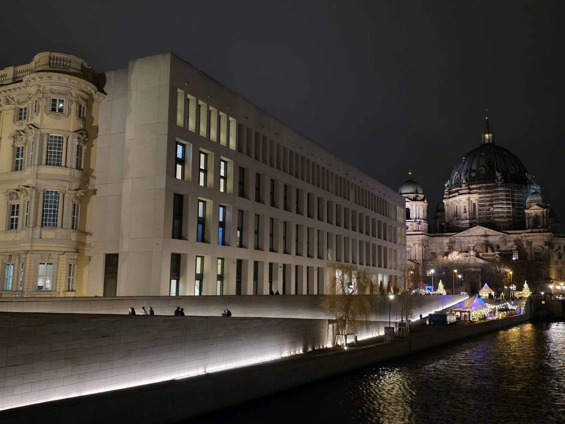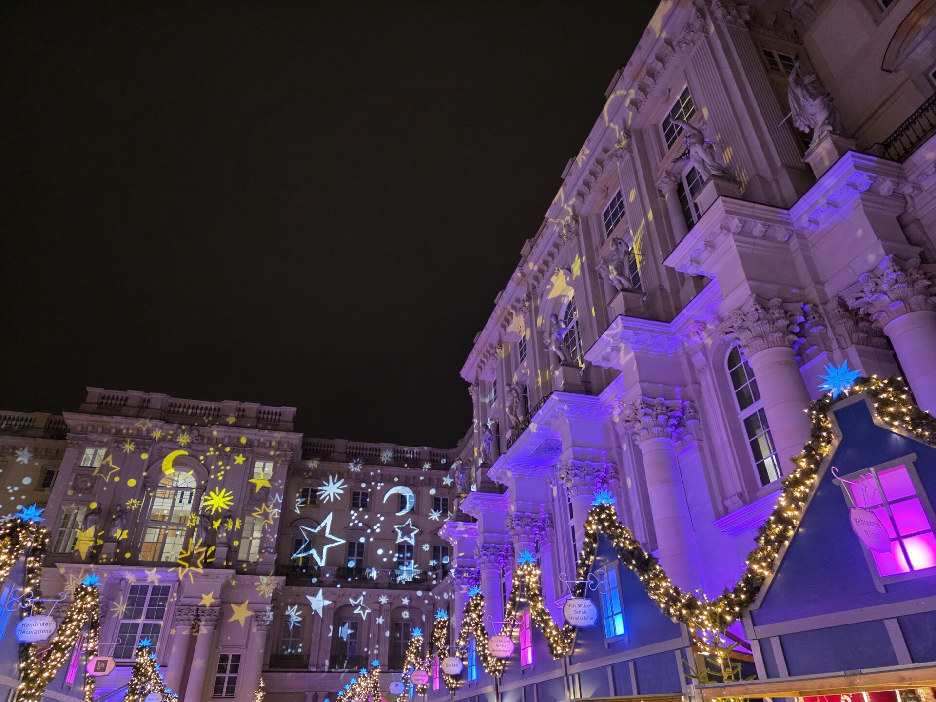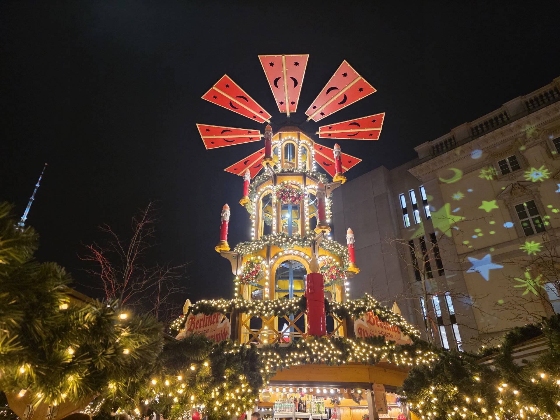 Først på aftenen gik vi igen til julemarkedet ved slottet. Der var nu fyldt med mennesker, og der var rift om siddepladserne. Vi delte en skorstenskage – denne gang med Nutella. Og bagefter smagte vi pizzabretzels. Lasershowet på slottet ud mod Spree var ikke det vildeste, så vi blev ikke og så det færdigt, men gik i stedet tilbage til lejligheden.
