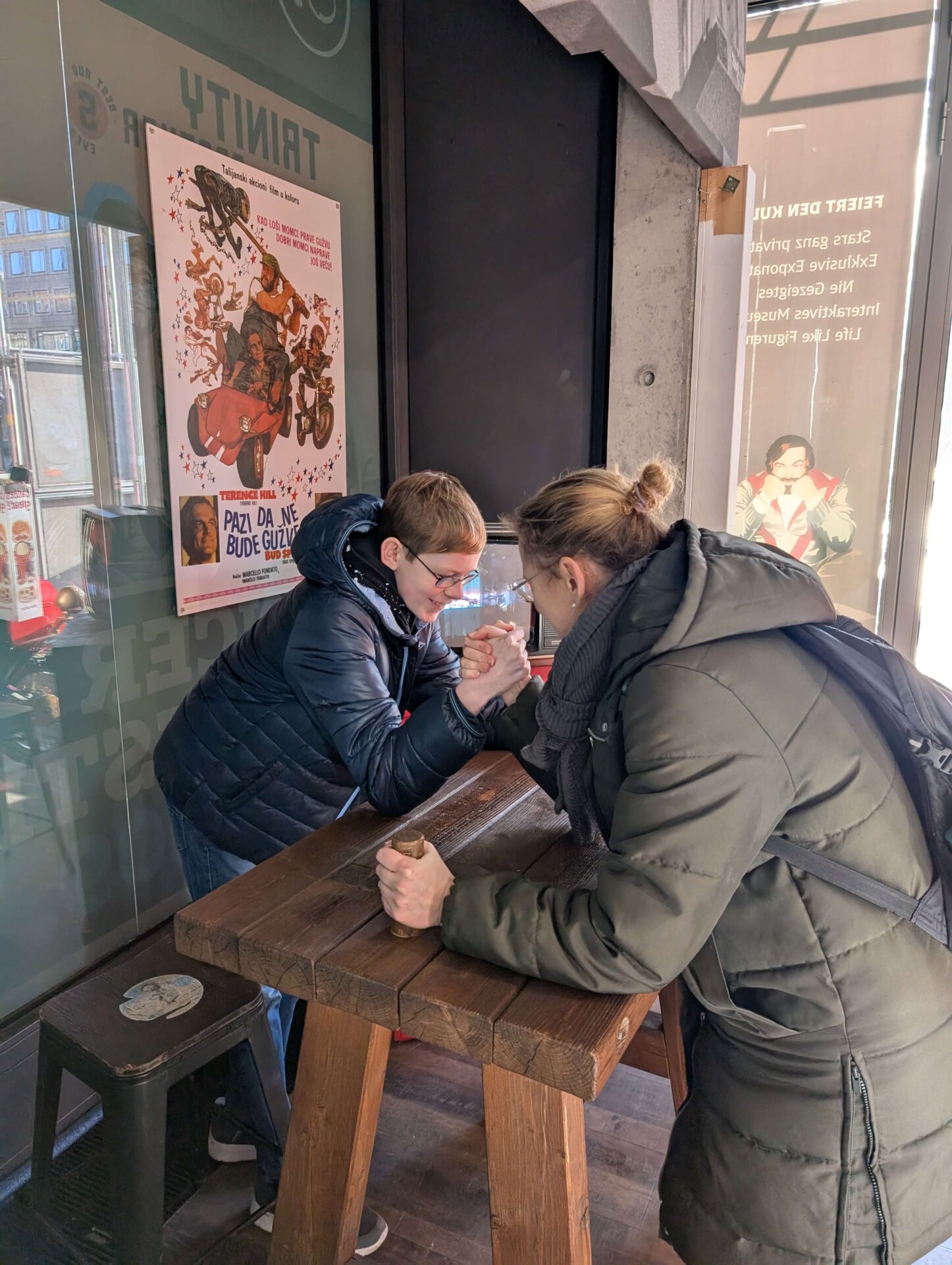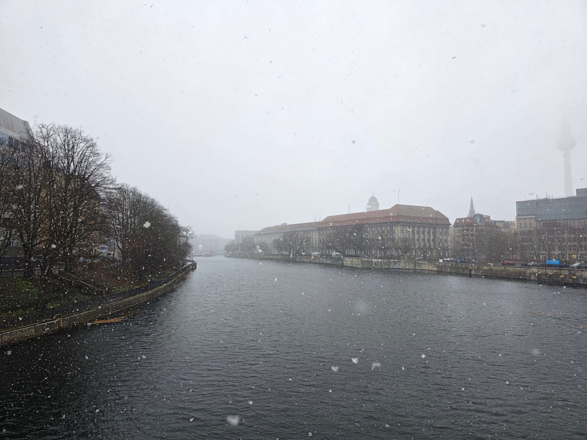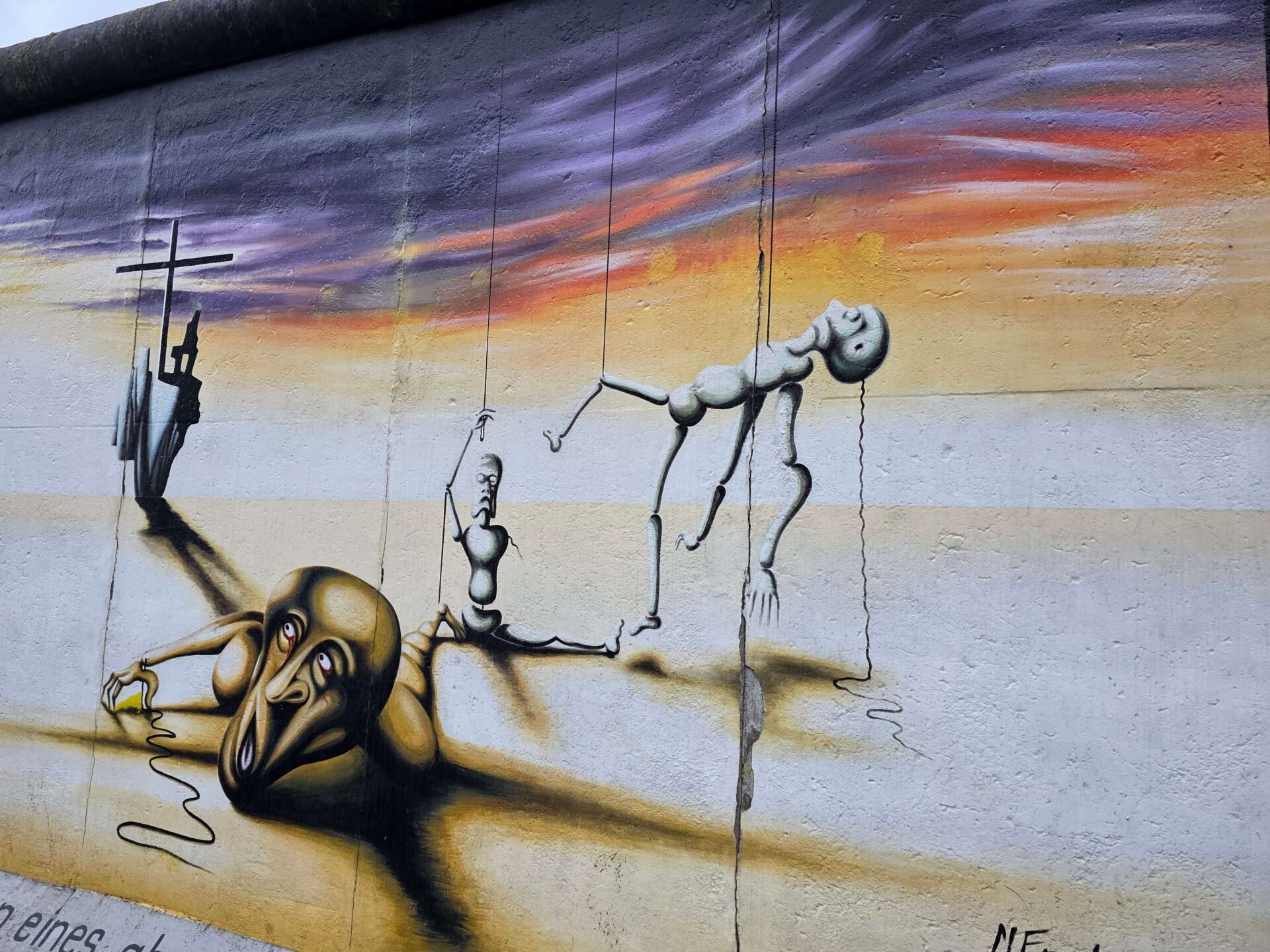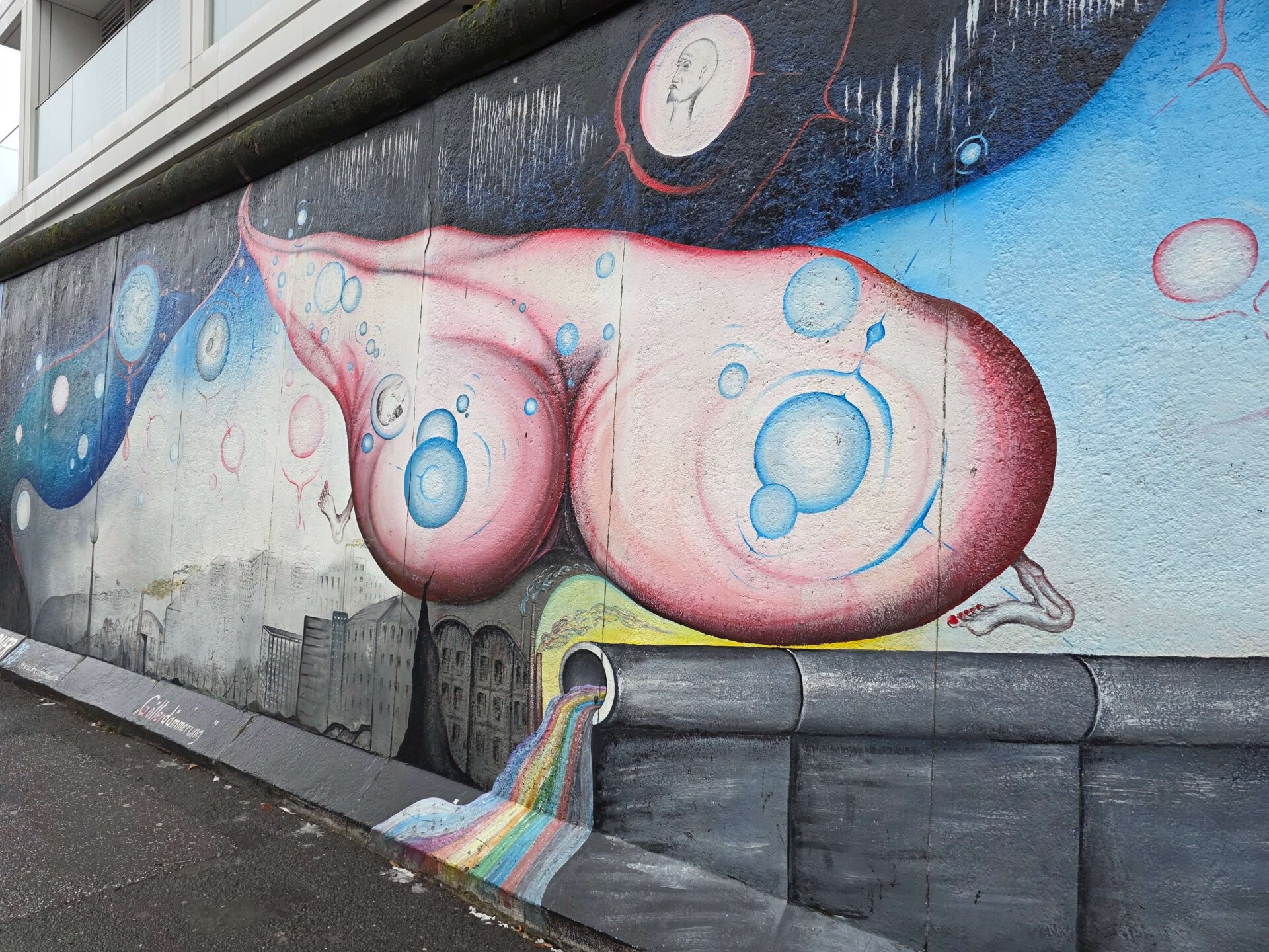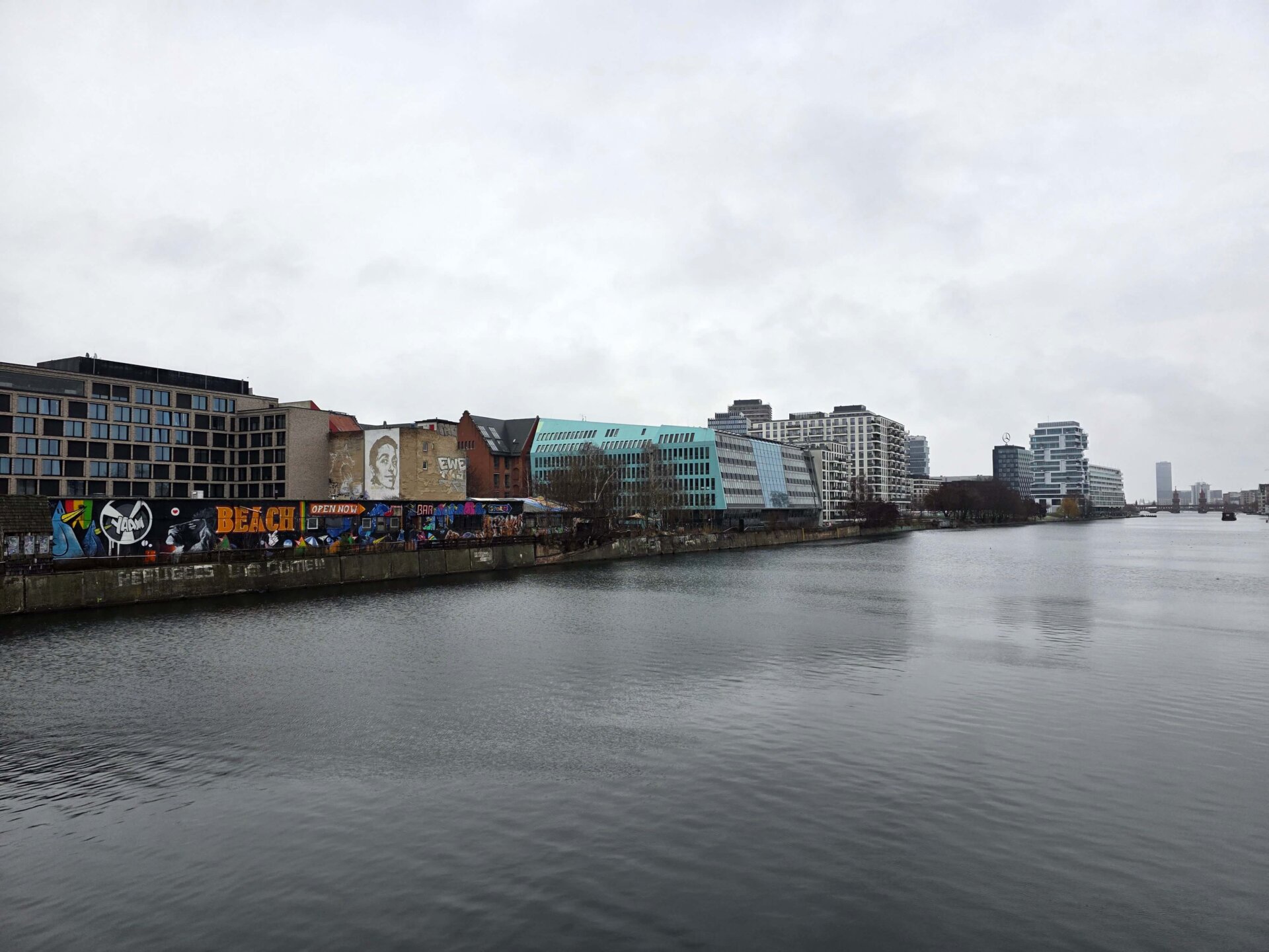 Vi kunne godt forudse, at det ville blive en lang dag og aften, hvis vi blot sad derhjemme hele eftermiddagen. Derfor gik vi midt på eftermiddagen en tur, mens Valdemar blev hjemme og slappede. Vi gik forbi Uber Arena og en tur i East Side Mall, som vi ikke har besøgt tidligere. Hjemturen tog vi langs East Side Gallery sammen med mange andre turister, der også havde trodset det kolde, våde vejr.