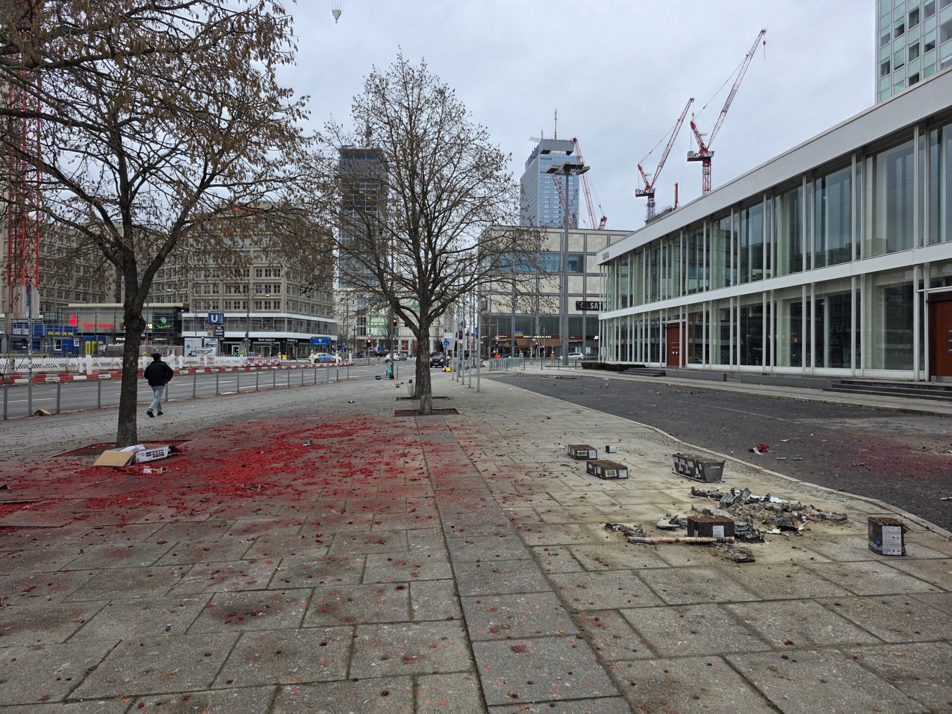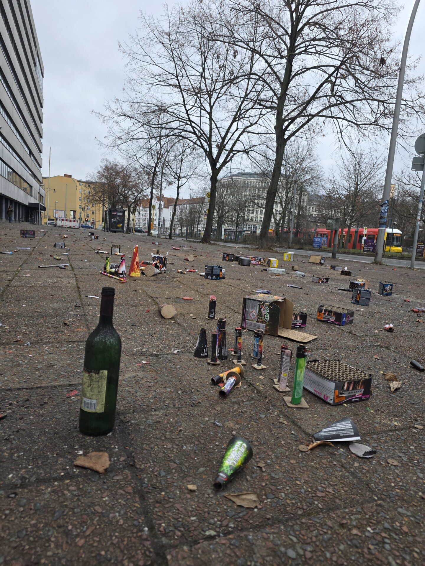 Omkring kl. 22 gik vi en tur. Der var allerede godt gang i fyrværkeriet. I år er zonen med fyrværkeri-forbud udvidet, så det nu gælder på begge sider af Alexanderplatz St., og dermed også omkring Fjernsynstårnet. Alle blev kropsvisiteret af de tungt udstyrede betjente for at få lov at komme ind på Alexanderplatz. Casper fremviste for en sikkerheds skyld vores lille rest af knaldperler, og så blev vi vist betragtet som harmløse og slap ind med en meget let kropsvisitation, mens andre virkelig blev ’klappet’ overalt.