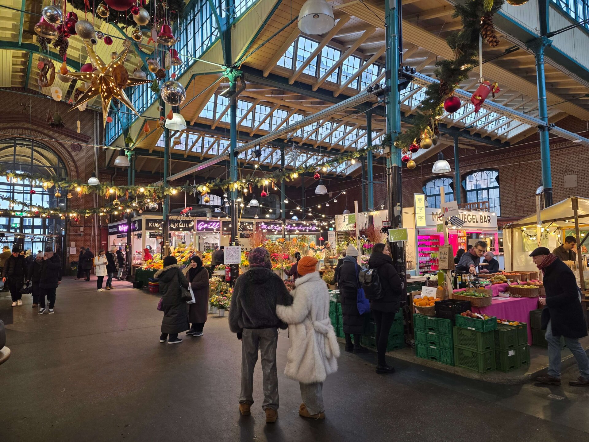 Efter et besøg i den enorme sportsbutik, Decathlon (de har ALT til sport!), fortsatte vi til Markthalle Neun, der er et stort, indendørs madmarked. Al maden så lækker ud. Vi valgte et par focacciaer og en portion pasta, som vi delte, inden vi igen gik ud i det kolde vintervejr. Casper ville gerne lige hjem og have tørre sokker og sko på, så vi rundede lige lejligheden.