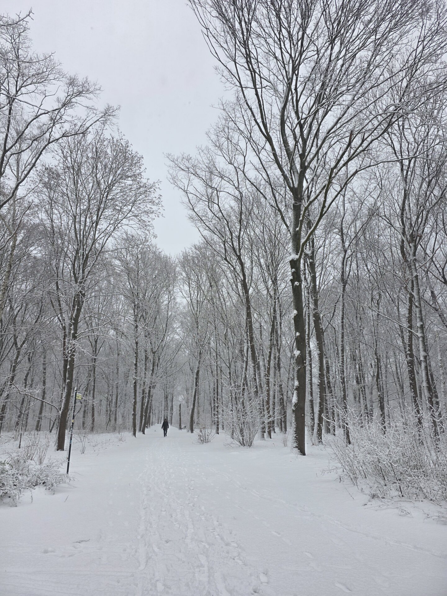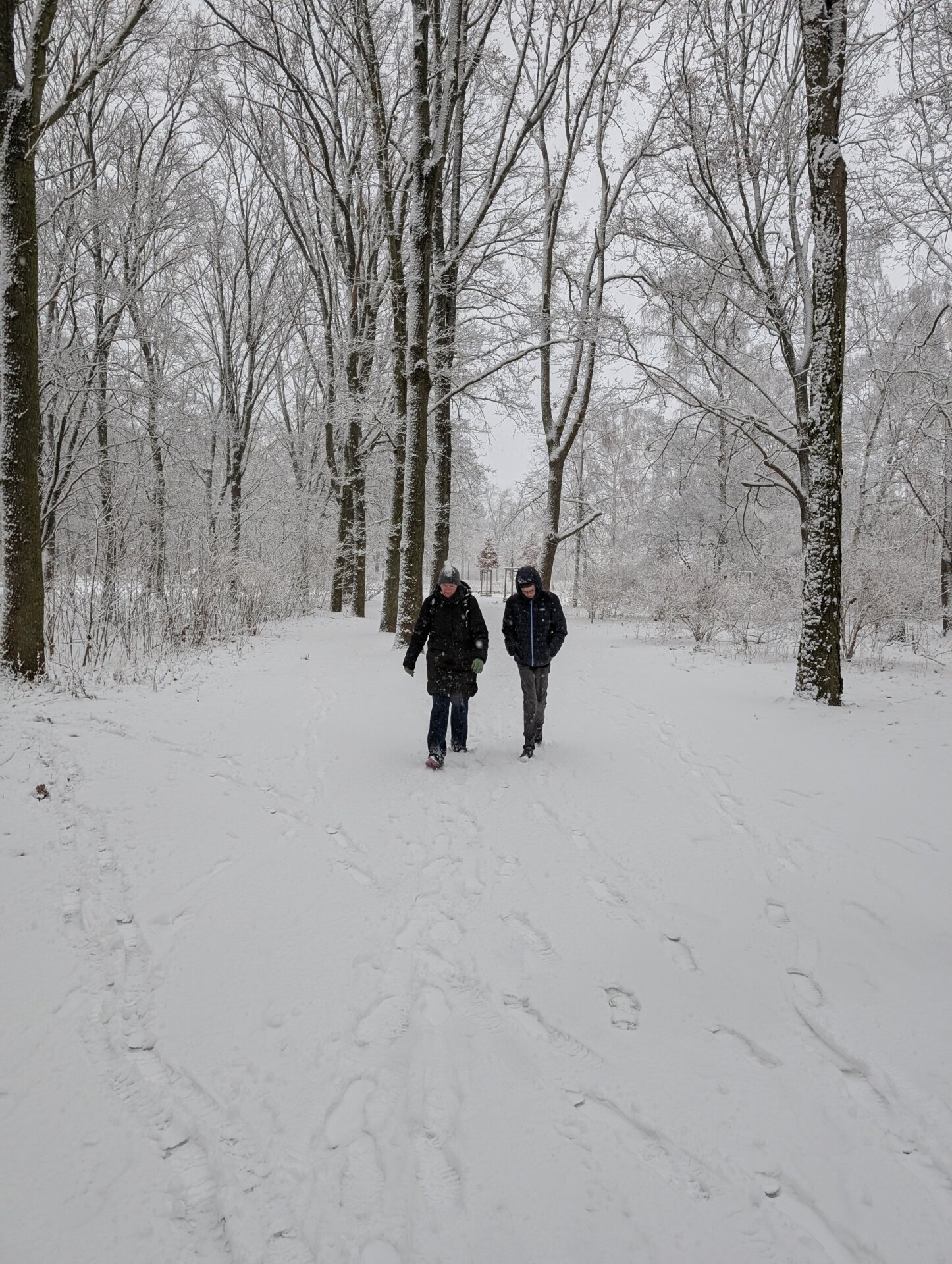 På turen gennem Tiergarten var vi på flere stier de første, der gik i sneen. Britt havde ikke lige tænkt på, at de lange, brede jeans sugede sne til sig, så de snart var gennemblødte halvt op ad skinnebenet, og Valdemars vanter blev selvfølgelig også gennemblødte.