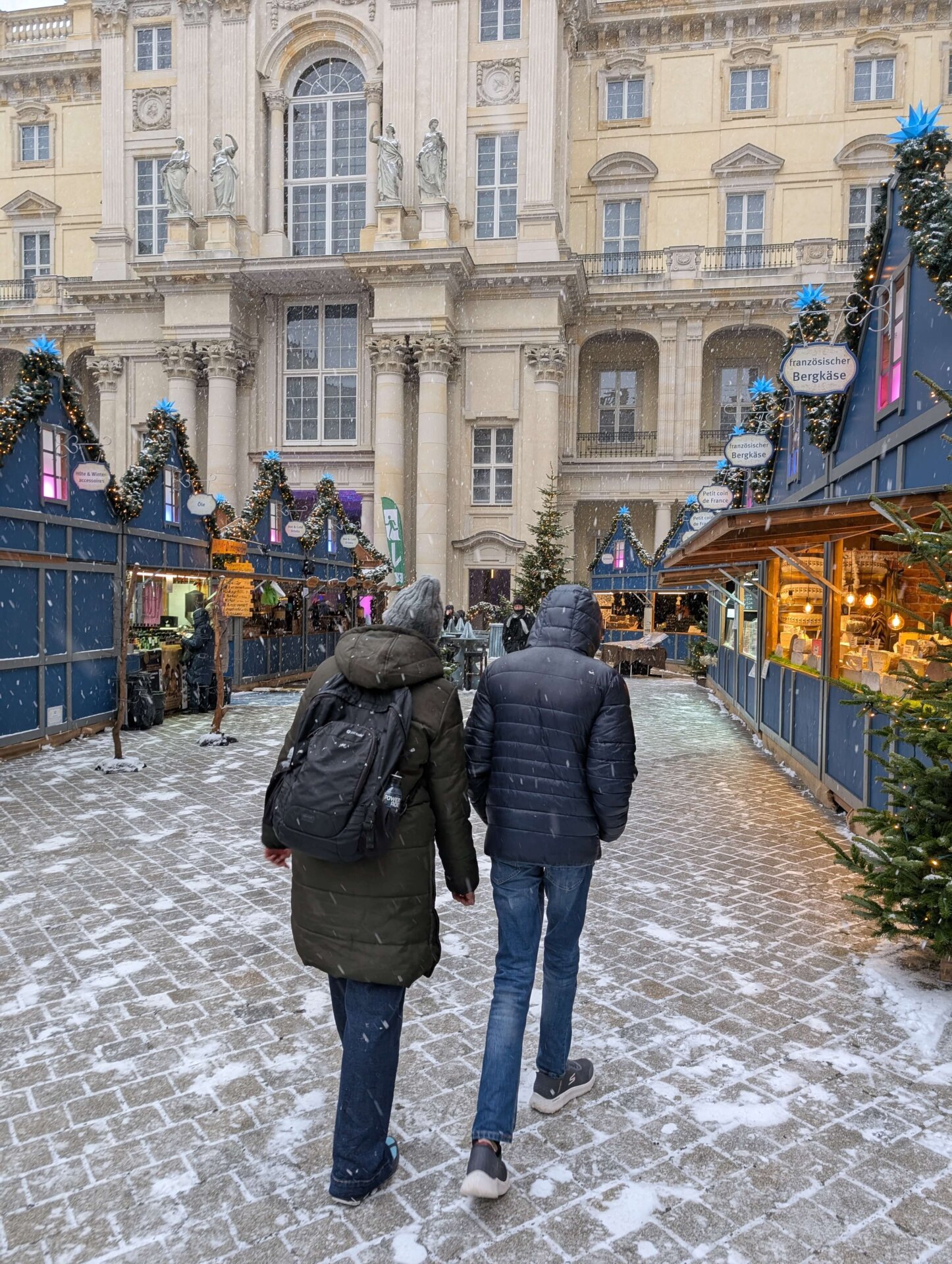 Valdemar vågnede først kl. 10, så igen sov han 12 timer. Valdemar var nok helst blevet hjemme, men vi gik alligevel en tur ned til julemarkedet ved slottet – et af de eneste, der stadig har åbent. Selvom det var begyndt at tø, kunne vi stadig nyde lyden af at gå i den knirkende sne. Nej, ligesom man ikke salter fortovene, rydder man dem heller ikke for sne.