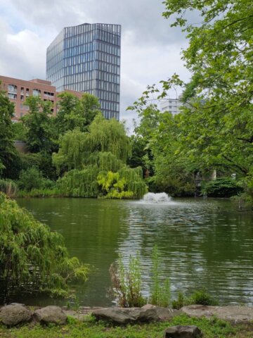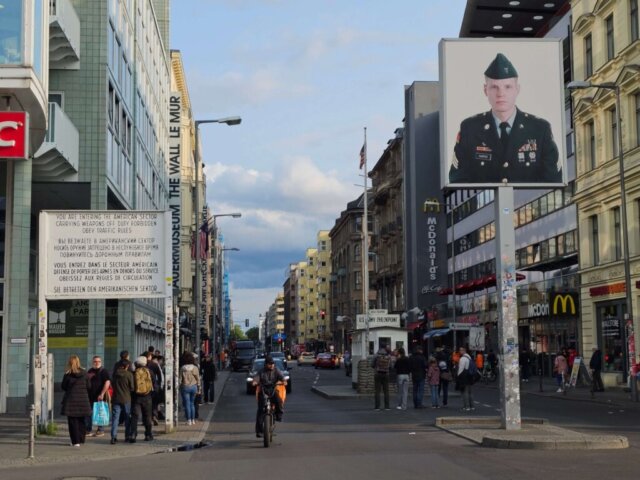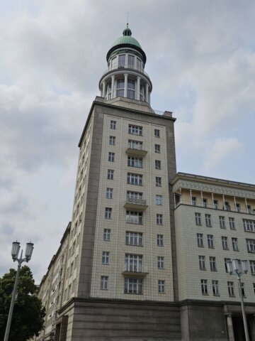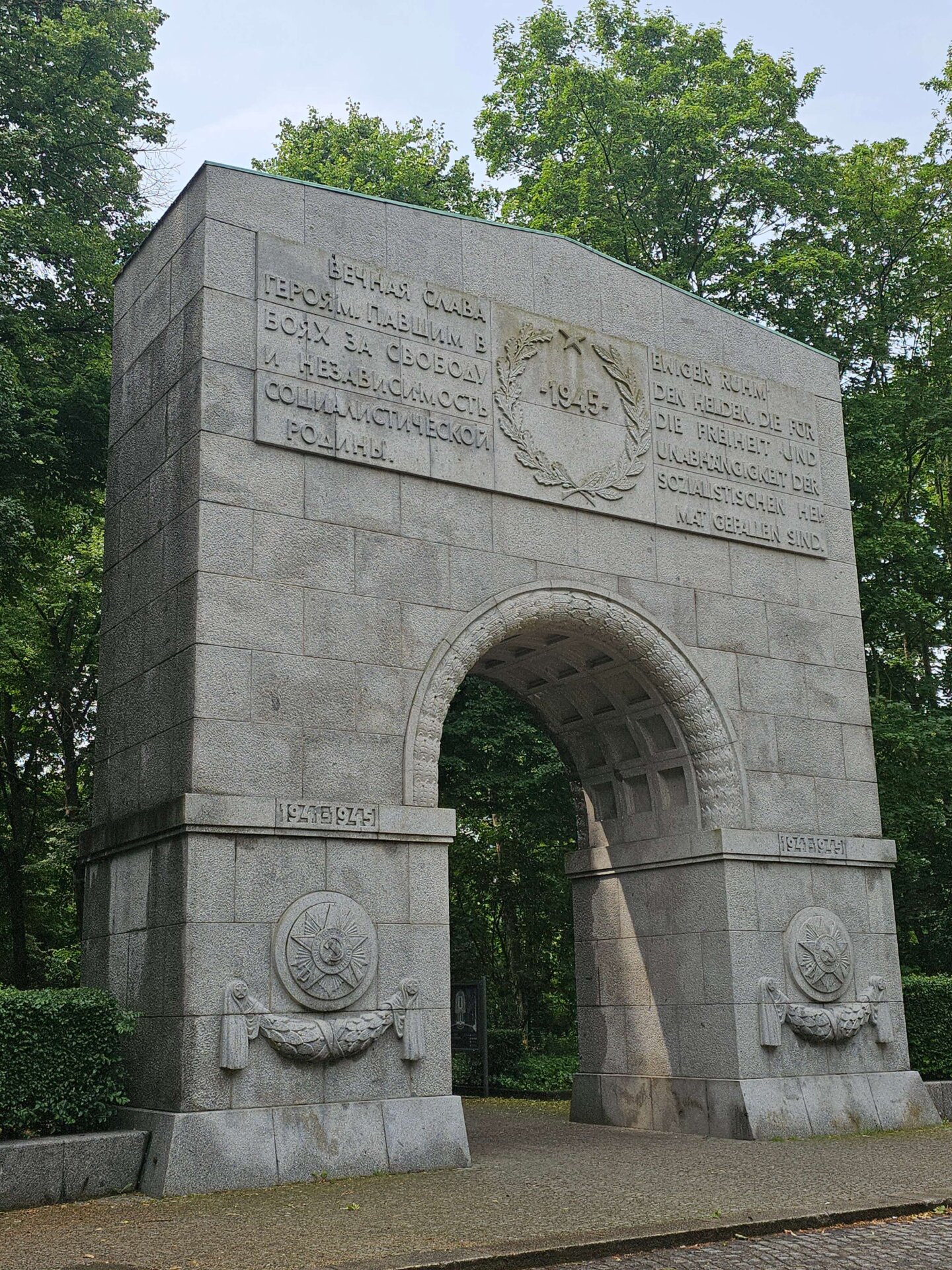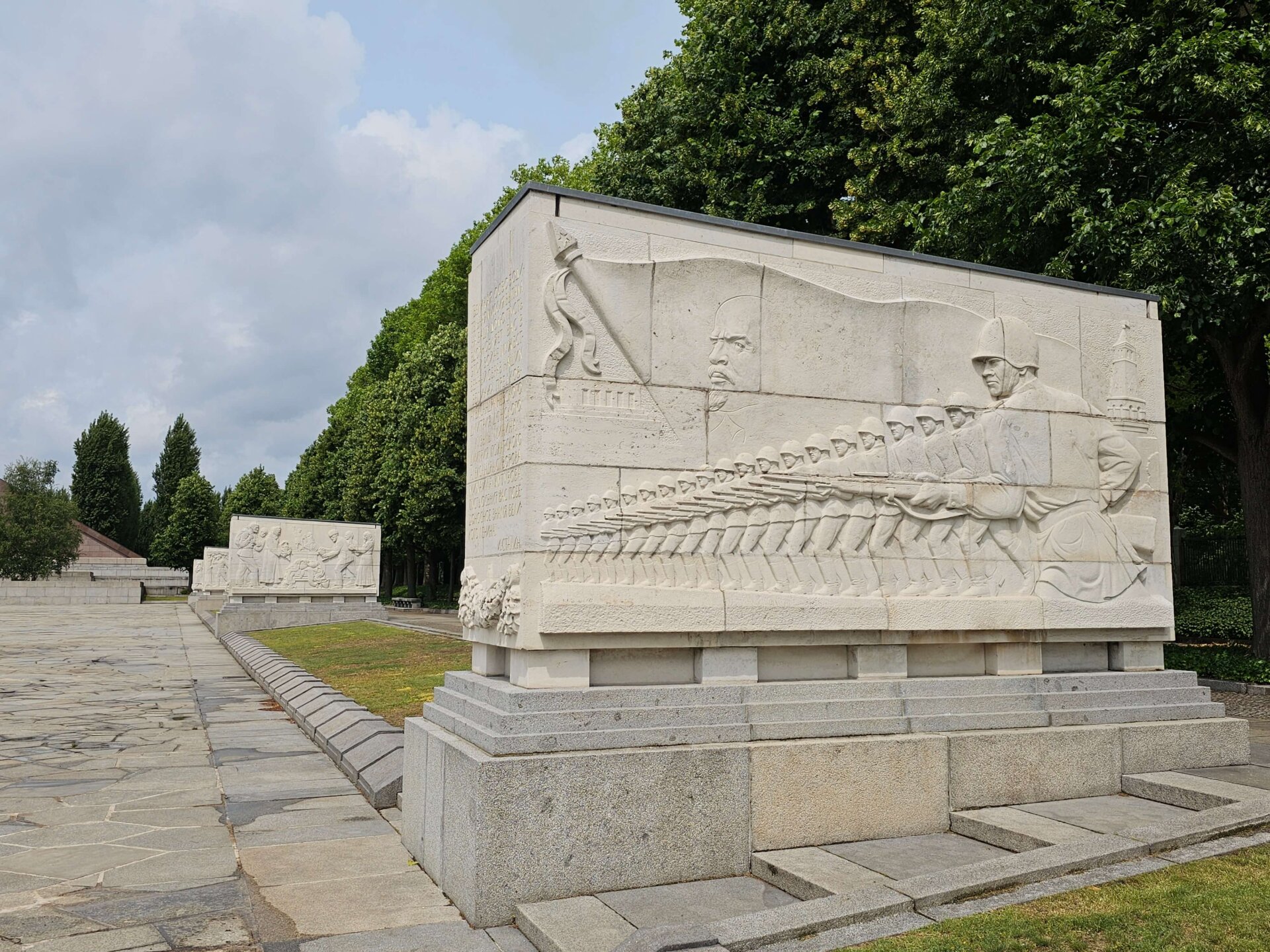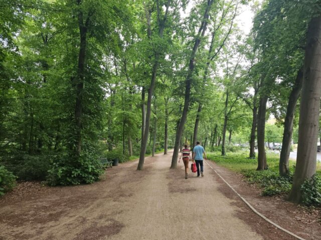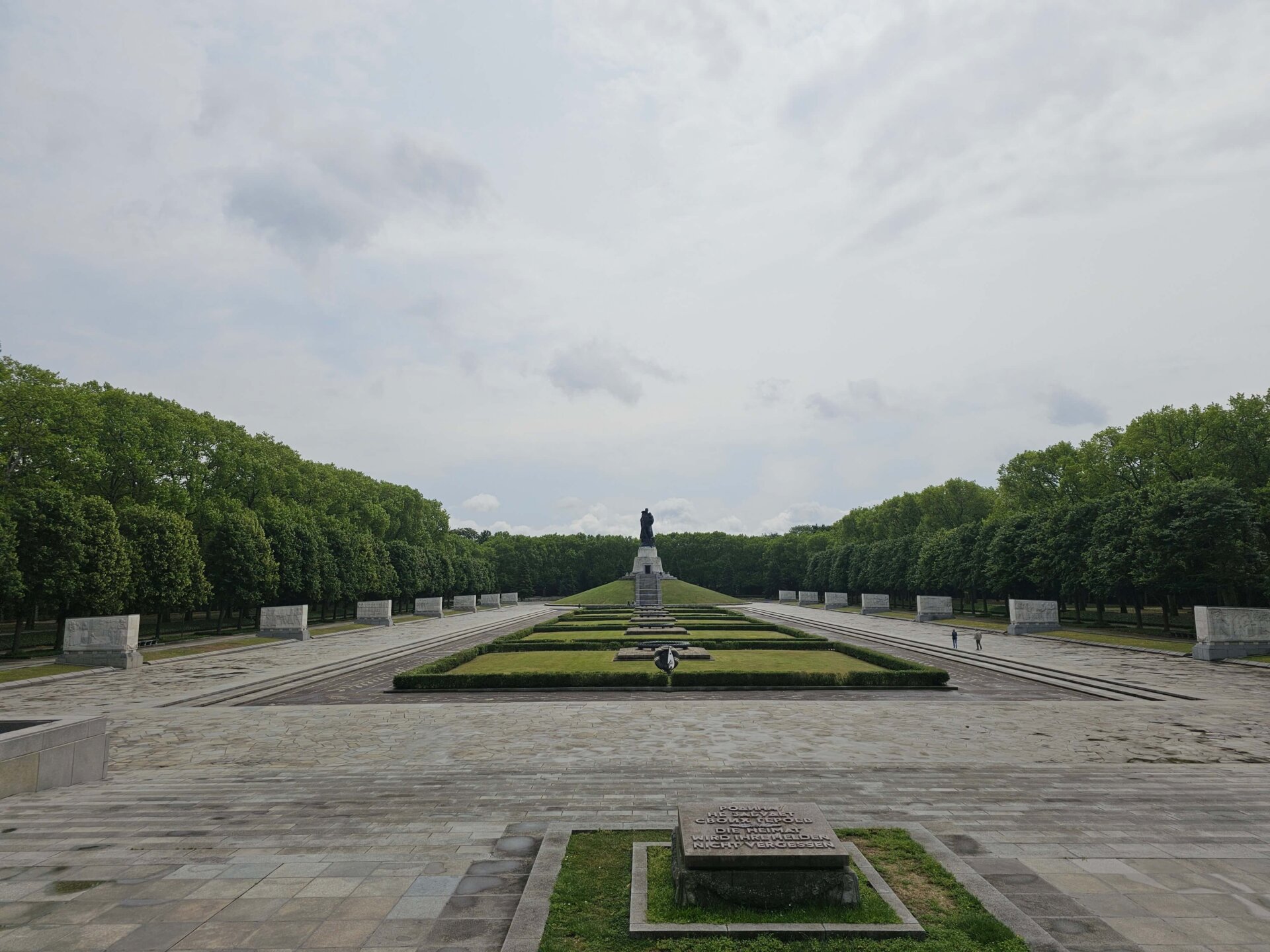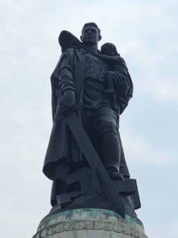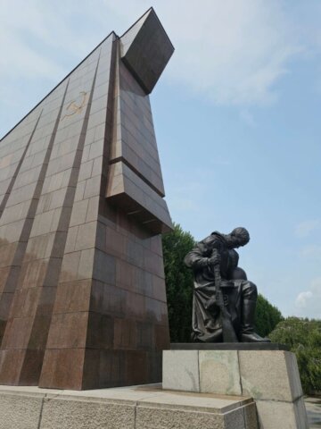 Da vi var færdige med at spise vores morgenmad, var det holdt op med at regne. Vi fastholdt dog planen om at benytte offentlig transport og tog derfor sporvogn og efterfølgende s-toget til en station tæt på Treptower Park. I parken besøgte vi det imponerende sovjetiske monument, rejst i 1949 – dels som et monument for sejren over nazismen, og dels som grav for 7.000 sovjetiske soldater, der mistede livet under krigen. Vi fortsatte lidt gennem parken og gik så langs vandet tilbage til toget.
