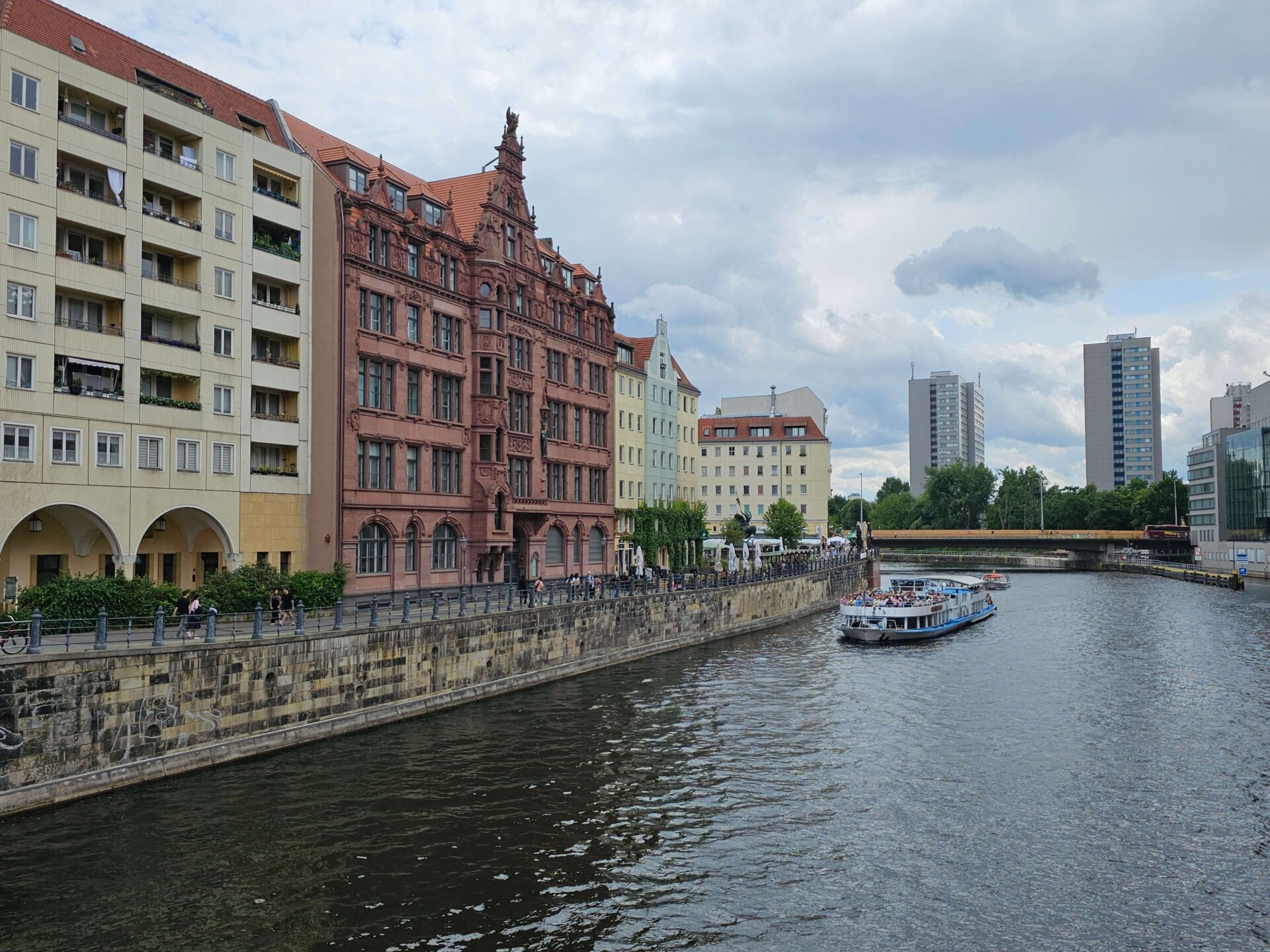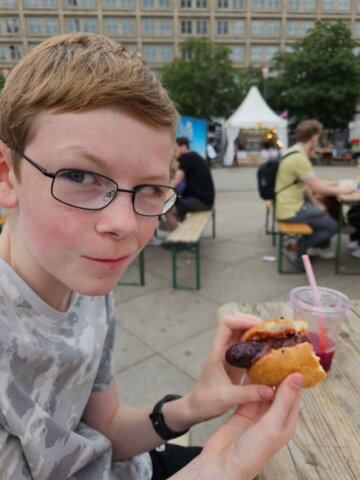 På Alexanderplatz var det Soulfestival, der udover sceneoptræden også bød på madboder fra forskellige lande. Valdemar vil helt klart tilbage og spise frokost eller aftensmad der en af dagene – især da han så, at den tyske bod serverede käsekrainer. Dagens aftensmad var dog henlagt til Carambar, hvis omfattende menukort overtrumfede en belastende tjener. Vi fik alle lækker og rigelig aftensmad – som altid. Farmor, Farfar og Jan skal hjem i morgen, så dem sagde vi farvel til udenfor restauranten.