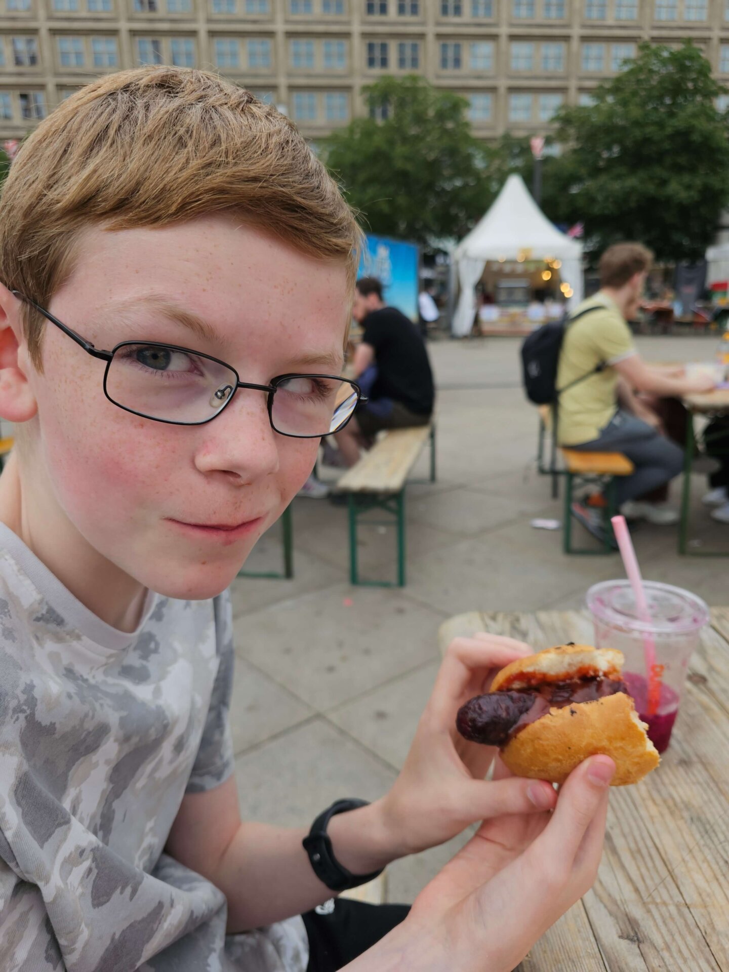 Vi havde ikke rigtigt heldet med os i butikkerne – altså lige bortset fra i Lindt, hvor vi købte ‘en smule’ chokolade. Sidst på formiddagen gik vi derfor til Alexanderplatz for at shoppe videre. Boderne med streetfood var der stadig, så det blev til en britisk shepherd’s pie og en tysk, rødbedefarvet käsekrakauer, der var en fin erstatning for en käsekrainer, der ellers er Valdemars favorit.