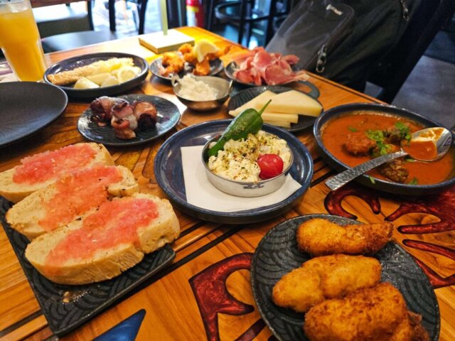 Med ni forskellige tapasretter på en spansk restaurant fik vi lavet vores egen lille lækre buffet. Trods en ihærdig indsats kunne vi ikke spise op, og der var ikke plads til dessert. På vejen hjem var vi et smut i Rewe, og da vi kom ud, stod det ned i lårtykke stråler. Med undtagelse af enkelte små dråber er vi ellers sluppet for regn hele dagen. Vi stod i læ et sted sammen med mange andre, og da det ganske kort tid efter var stilnet lidt af, skyndte vi os hjem.