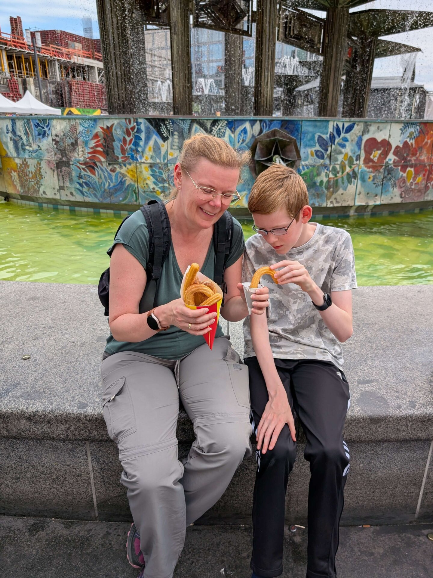 Endelig ude af Primark delte Britt og Valdemar en pose churros med Oreo-chokoladesovs. Det gav energi til en tur i Galeria, hvor vi dog intet købte, men reddede os et par gratis sodavandsis. Alligevel havde Valdemar efterfølgende også plads til en drik med vandmelon og dragefrugt fra Dunkin’ Donuts. Nej, ingen donuts denne gang.